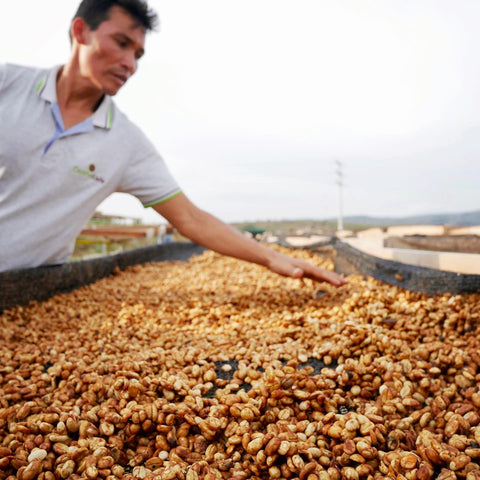 Concrètement, après avoir retiré la peau et la pulpe de cerise à l’aide du dépulpeur et avoir laissé fermenter les grains 12 à 24 heures, ils iront sécher au soleil sans être rincé à l’eau. Généralement les grains sécheront sur des lits en moustiquaire surélevés et doivent être remués fréquemment pour éviter qu’ils collent ensemble ou qu’ils moisissent.